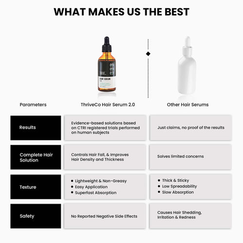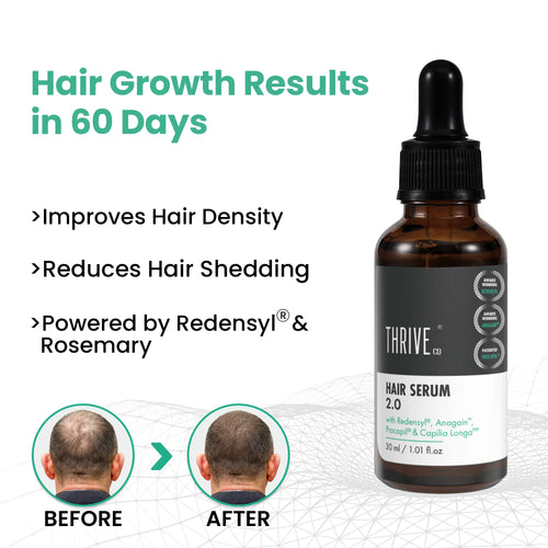 Now is a great time to start. Your scalp is ageing 6 times faster than the rest of your skin and body. This formulation reactivates thinning and dormant hair. For completely bald areas of the scalp, there may be no way to promote hair regrowth. If you still have hair follicles, the serum may be beneficial to you. Not sure? Email us at care@thriveco.in to have our specialists evaluate your scalp conditions to see if ThriveCo Hair Growth Serum 2.0 is suitable for you.