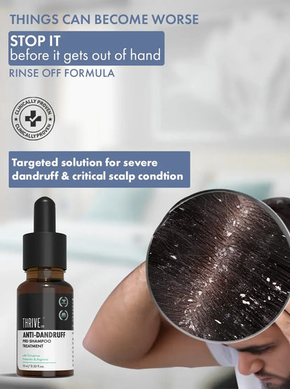 - NEXT-LEVEL DANDRUFF TREATMENT: ThriveCo Anti-Dandruff Pre-Shampoo Treatment starts treating dandruff and itchy scalp right from the first use due to the presence of dandruff remover active Octopirox, hydrating Pentavitin and breakage-reducing Arginine.