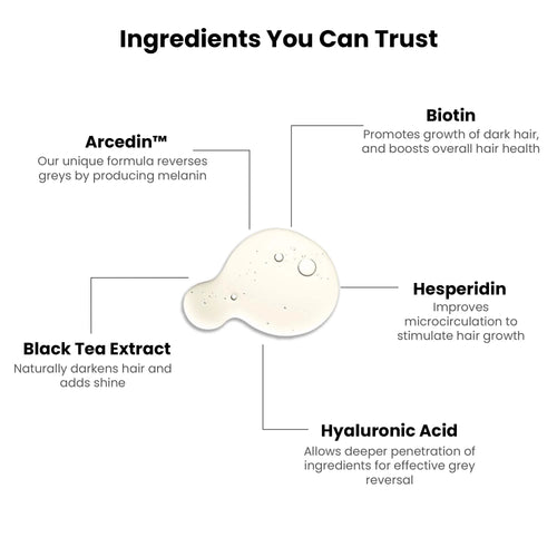 • REVERSES GREYS: NO CLAIMS. ONLY EVIDENCE. This clinically-proven serum is developed with Arcedin (a potent blend of anti-greying Arcolys, Biotin, and Melanogray), along with Black Tea Extract, which offers evidence-backed treatment for premature greying and promotes hair vitality. 92% STARTED SEEING RESULTS IN THE FIRST 6 WEEKS. The pathbreaking results have been recognized and published by the international Journal of Cosmetic Dermatology.