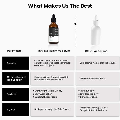 Experience up to 46.28% reduction in grey hair in just 8 weeks with ThriveCo’s Hair Prime Serum. Clinically proven to naturally darken grey hair. Based on Clinical trials registered at CTRI (Clinical Trial Registry of India) for 8 weeks.