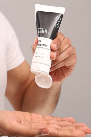 - VOLUMINOUS HAIR IN 1 MINUTE: ThriveCo Hair Thickener Volumizing Serum instantly adds volume to fine and thin hair. It is specially formulated for men and women who experience flat hair, wide parting, bald spots and receding hair line.