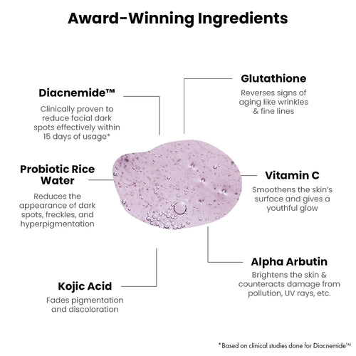 AWARD-WINNING INGREDIENTS: ThriveCo's exclusive Diacnemide™ clarifies skin by reducing acne-causing bacteria and acne severity. Brightening ingredients like Vitamin C, Kojic Acid & alpha-arbutin actively removes tan, lightens dark spots, pigmentation & promotes even looking skin. Glutathione protects the skin against oxidative damage which leads to wrinkles & reverses acne, wrinkles and crows feet via detoxification of the skin. Infusion of Probiotic Rice water helps protect skin from environmental damage.