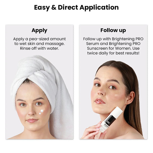 HOW TO USE: Apply a pea-sized amount to wet skin and massage. Rinse off with water. Follow up with Brightening PRO Serum and Brightening PRO Sunscreen for Women. Use twice daily for best results.
