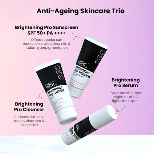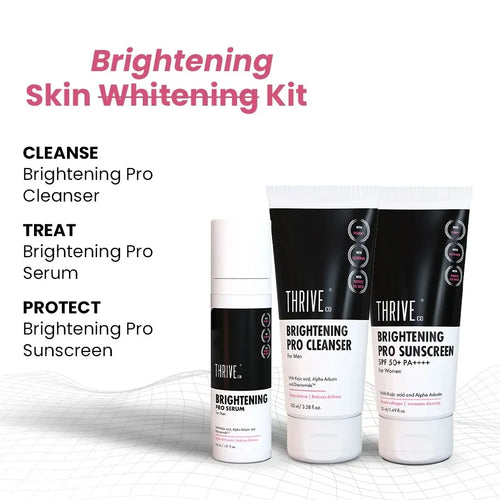 The brightening kit includes a cleanser, serum, and sunscreen, each designed to work together to reduce dark spots, hyperpigmentation & fight signs of aging.