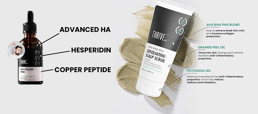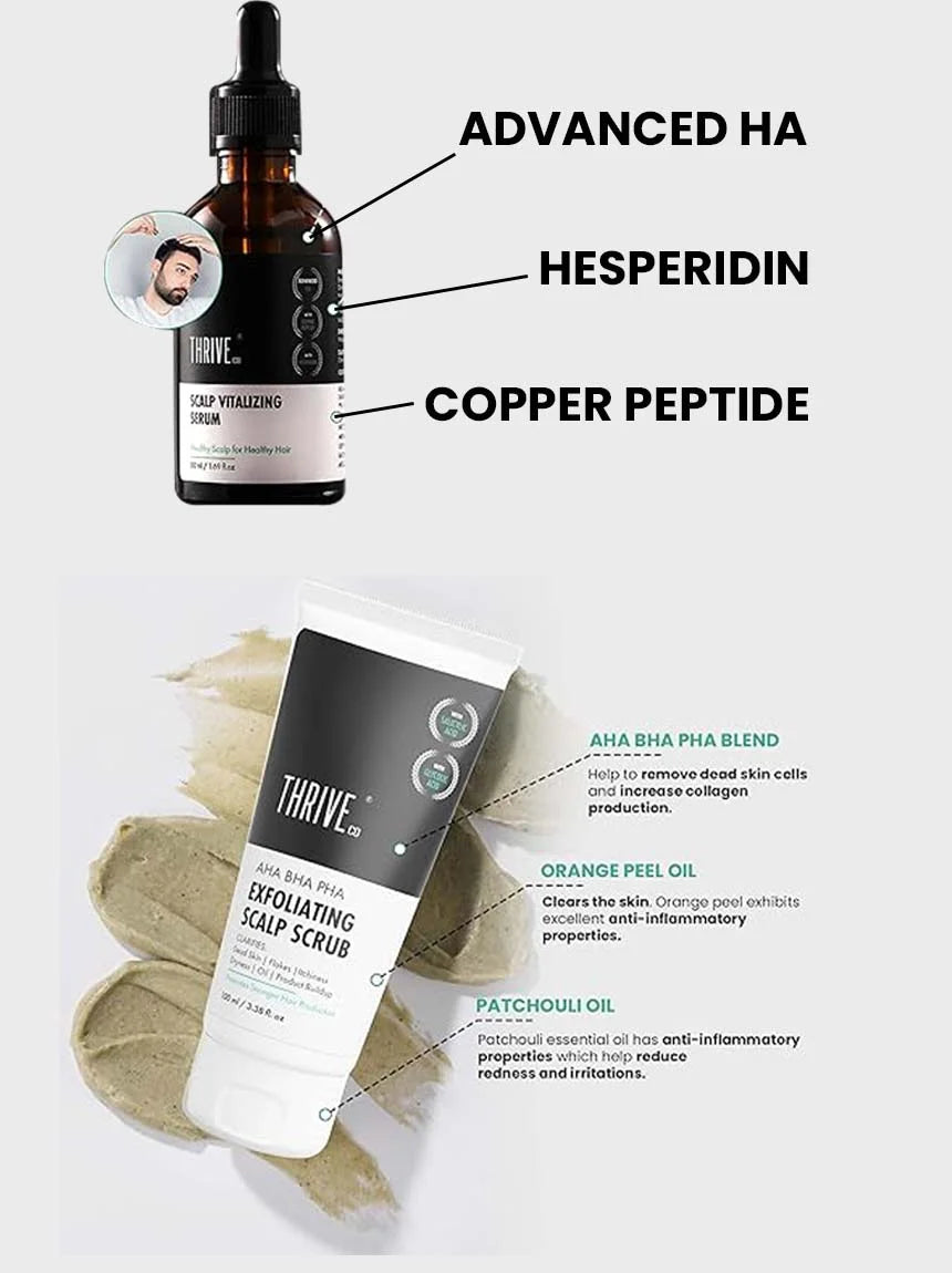 EXFOLIATING SCRUB POWERED BY: A supercharged trio of gentle exfoliating actives, AHA BHA PHA blend removes buildup and sebum; Orange Peel Extract targets dandruff; and Patchouli Oil works on the scalp infection and soothes the scalp. VITALIZING SERUM POWERED BY: Cationically charged Hyaluronic Acid for sustained hydration; Copper peptides to help build collagen and elastin in the hair follicles; and Hesperidin to improve microcirculation to promote new hair growth.