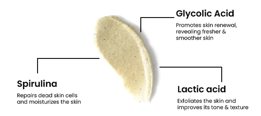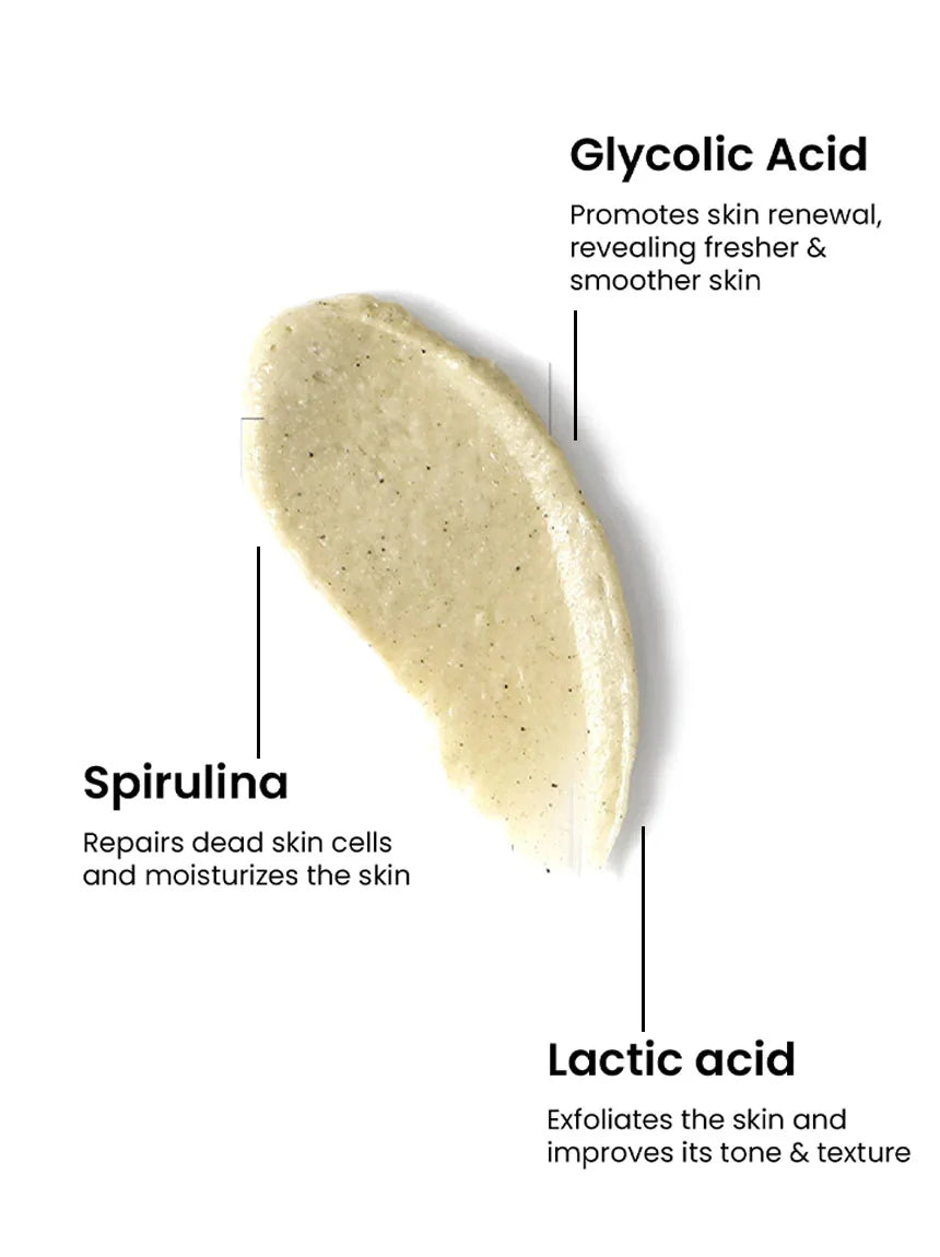 Aqua, Cetearyl Alcohol, Glycolic Acid, Lactic Acid, Glycerine, Ceteareth-20, Cellulose, Glyceryl Stearate, PEG-100 Stearate, Cetrimonium Chloride, Isoamyl Laurate, Sodium Hydroxide, Sodium Cocoyl Isethionate, Spirulina Platensis Powder, Niacinamide, Allantoin, Ethylhexylglycerin, Phenoxyethanol, Tocopheryl Acetate, Arginine, Disodium EDTA, Perfume.