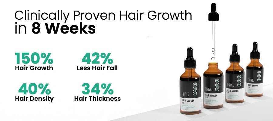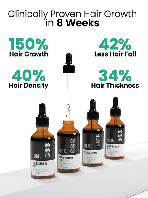ThriveCo Hair Serum 2.0 stands apart because it’s a clinically proven, science-backed formula with results published in British medical journal and supported by a proprietary blend that’s filed for patent. In clinical studies, the serum delivered exceptional improvements: 1.5× increase in the hair growth rate* 34% increase in Hair Thickness* 40% boost in Hair Density* 42% reduction in Hair Fall* Anagen:Telogen ratio shift from 57:43 to a healthier 80:20* (meaning significantly more follicles in the active growth phase) With over 6M+ bottles sold, this combination of validated science, proprietary innovation, and visible transformation is what makes it one of India’s most advanced and high-performing hair growth serums.
