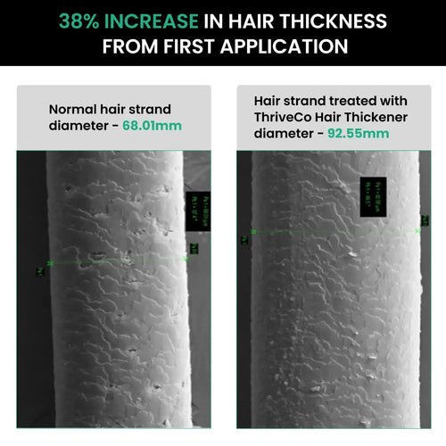 - "INSTANT BOOST IN THE CONFIDENCE: Hair Thickener Volumizing Serum when applied on hair shows 38% visible hair thickness from first application in SEM images of hair strands under electron microscope. Look and feel confident with lesser visible scalp, improved shine and overall hair health. "
