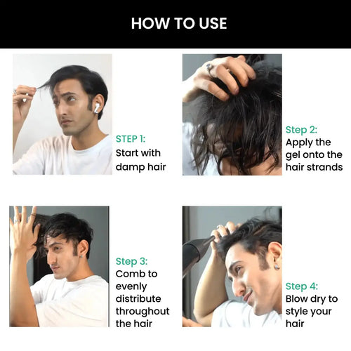 Start with damp hair. Apply the gel onto the hair strands & comb to evenly distribute throughout the hair. Blow dry to style your hair