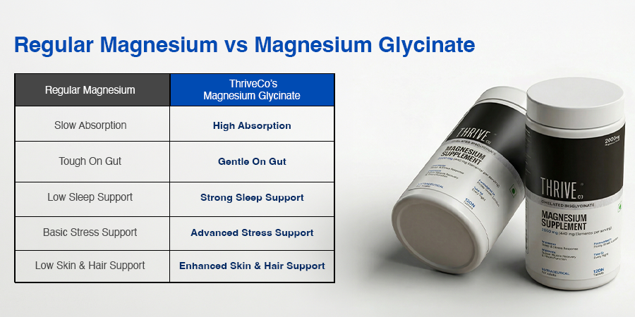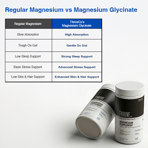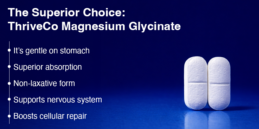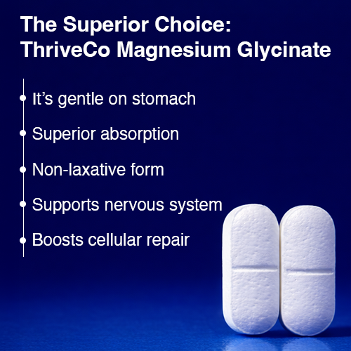 ThriveCo Magnesium Glycinate uses a chelated form of magnesium (magnesium bound to glycine) that:Ā Ensures superior bioavailability, is gentle on the stomach, and minimizes digestive discomfort commonly associated with other magnesium salts.Ā This allows efficient uptake by body tissues, reducing the need for more aggressive interventions.