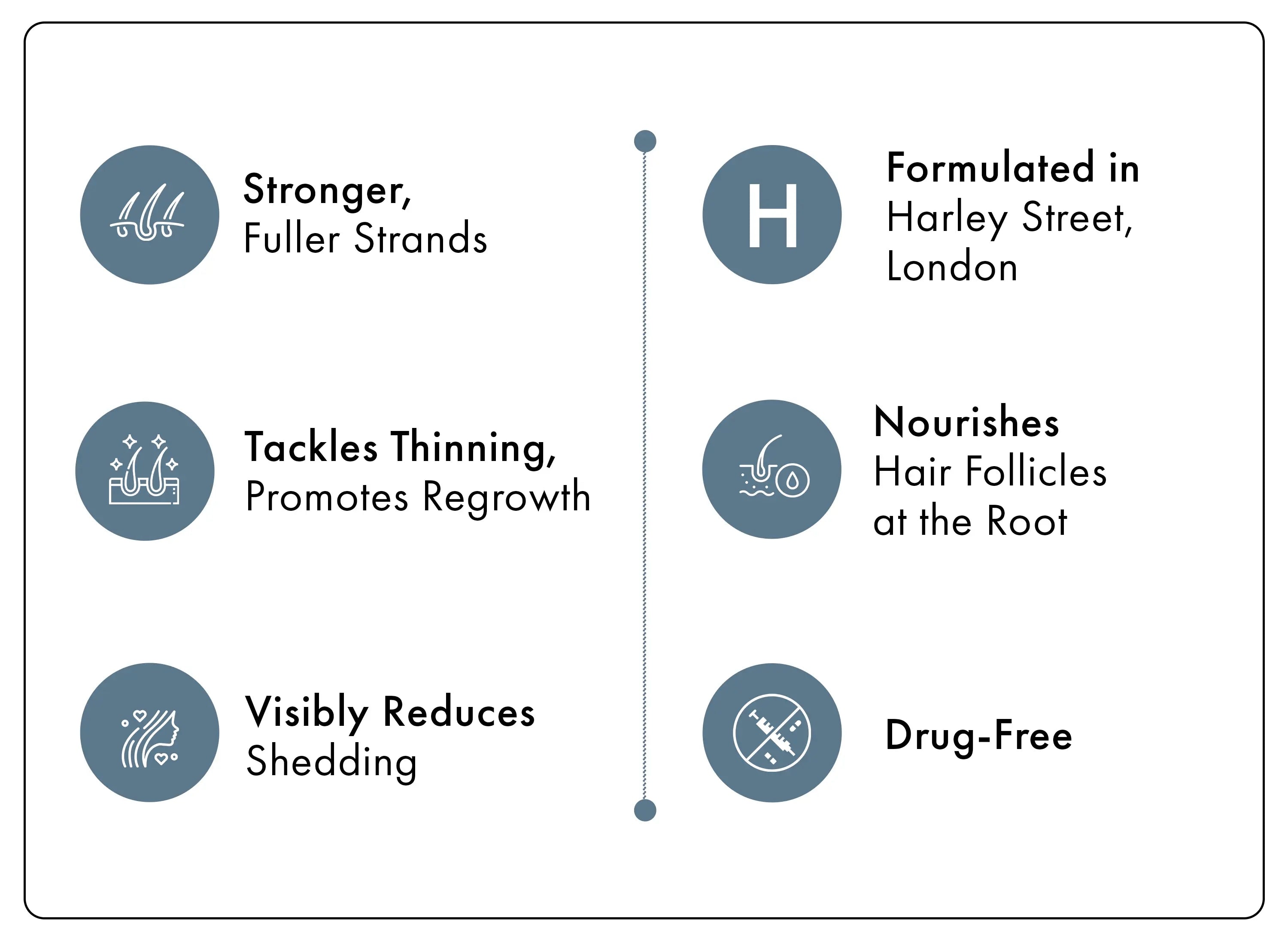 Helps reduce cortisol and stress-related hair loss. An adaptogen that calms the nervous system and reactivates follicles under stress.