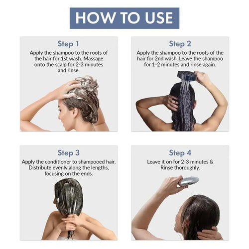 Massage shampoo to the scalp, hair and rinse off. Then apply conditioner on wet hair & distribute evenly along the lengths. Leave on for 2-3 minutes and rinse.
