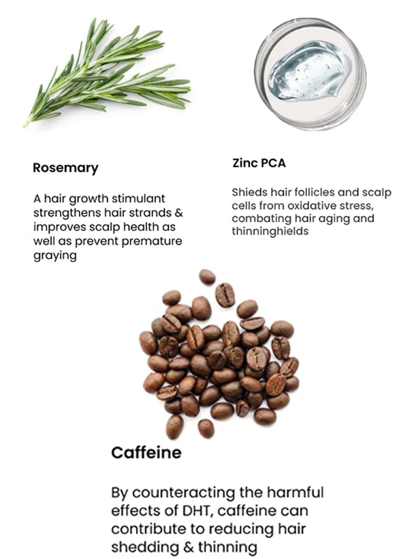The shampoo and contains conditioner contains potent ingredients including Rosemary, Caffeine, Pea Peptide & Zinc PCA that make hair stronger from the roots and prevent hair loss as well as promote new hair growth.