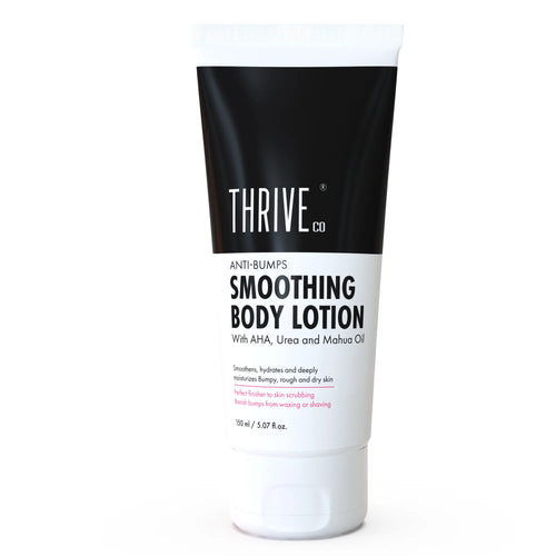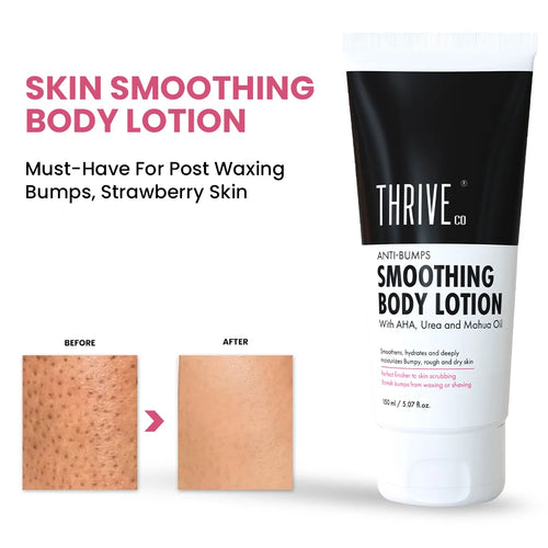 - BUMP-FREE SKIN: ThriveCo Smoothing Body Lotion is an anti-bump whole-body moisturizing formula, that gently exfoliates dry, rough & bumpy skin. Infused with Mahua oil, it effectively soothes itchy and irritated skin, and reduces the appearance of Keratosis Pilaris (also known as Strawberry Skin) for an effortlessly smooth look and feel.