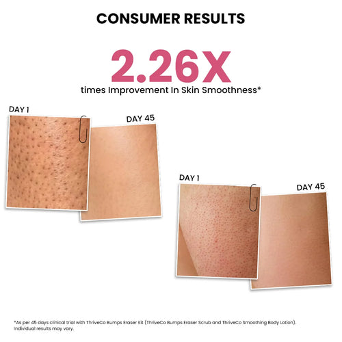 - ULTRA SMOOTH FINISH: IMPROVE SMOOTHNESS BY 2.26X TIMES IN JUST 45 DAYS.* Uncover your best skin with a lotion that deeply hydrates the skin & helps fight against the cracking of the skin. Apply this for silky, smooth skin post shaving or waxing. *As per 45 days clinical trial with ThriveCo Bumps Eraser Kit (ThriveCo Bumps Eraser Scrub and ThriveCo Smoothening Body Lotion)