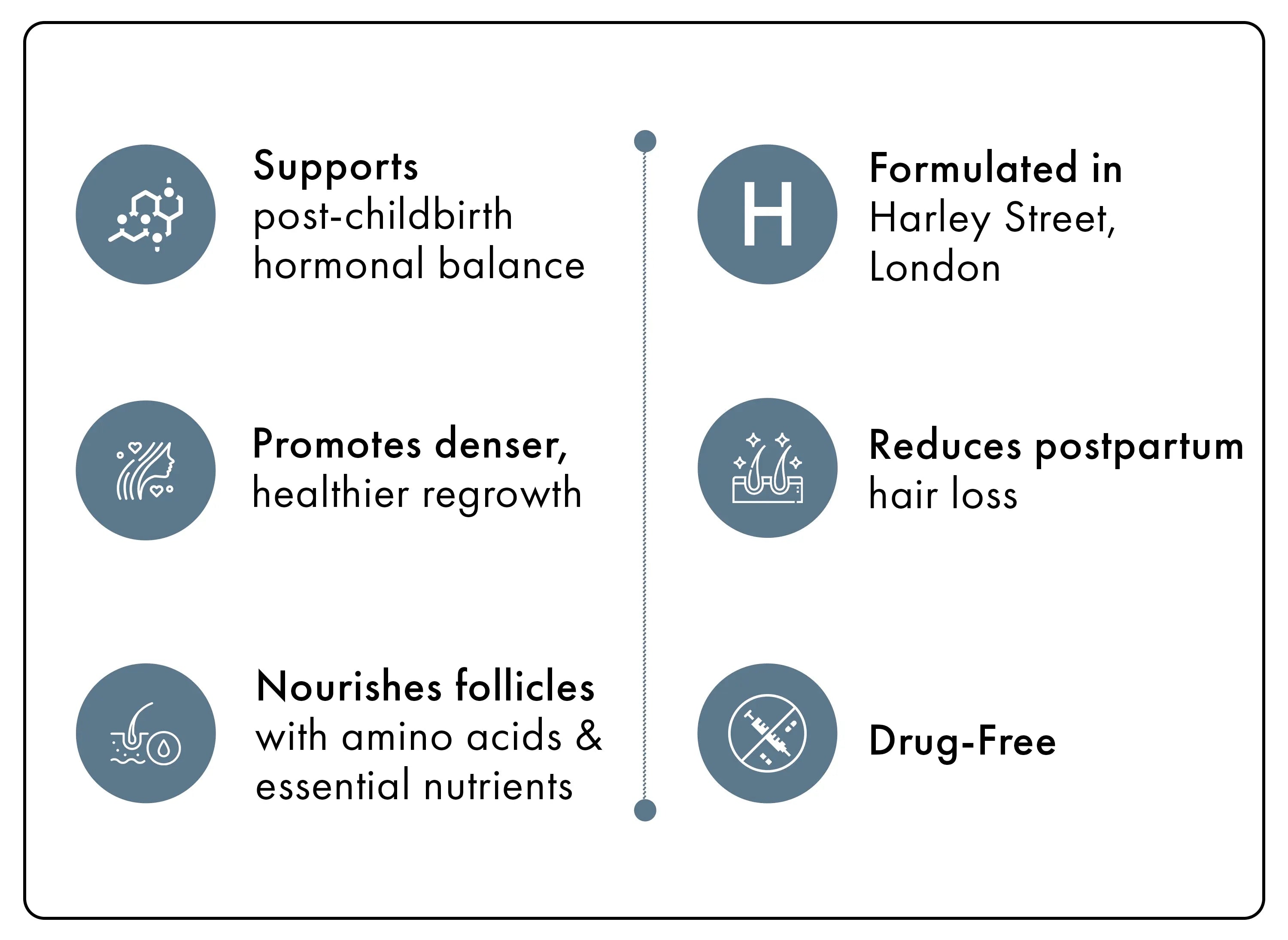 Supports postpartum hormonal balance, reduces stress-related shedding, and strengthens reproductive recovery.